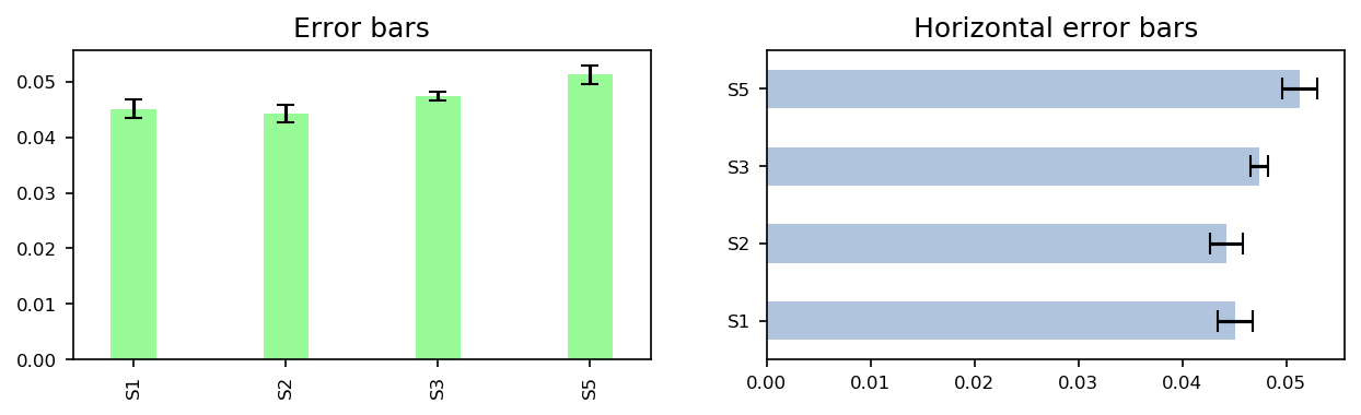 means.plot.bar(yerr=errors, capsize=4, color='palegreen', title="Error bars", width=0.3, fontsize=fontsize, ax=axes[0])